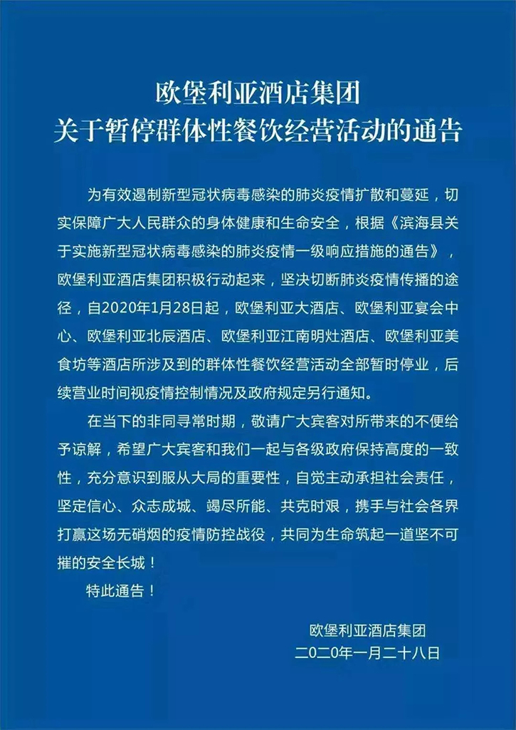 要求堅(jiān)決切斷肺炎疫情的傳播途徑,自2020年1月28日起,大酒店、宴會(huì)中心、北辰酒店、江南明灶、美食坊等酒店所涉及到群體性的餐飲經(jīng)驗(yàn)活動(dòng)全部暫時(shí)停業(yè),恢復(fù)營(yíng)業(yè)時(shí)間視疫情防控情況及政府規(guī)定再另行通知。