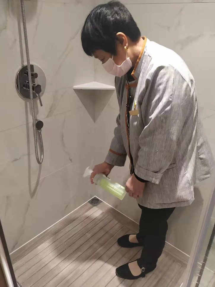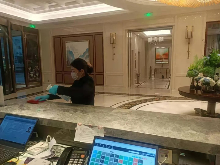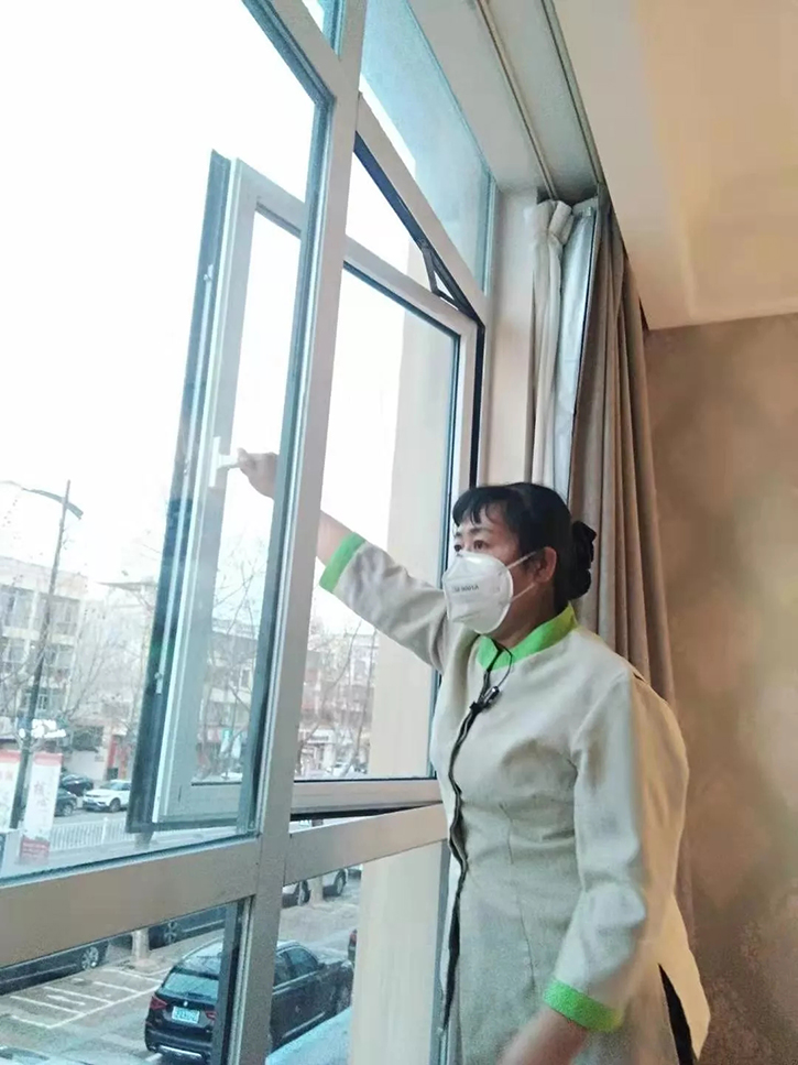 大堂、吧臺(tái)、每一間客房均放置了免洗消毒洗手液,為每一位進(jìn)入酒店的賓客提供免費(fèi)的清潔、消毒服務(wù)。客房服務(wù)員每天打掃客房更認(rèn)真了,加大了對(duì)客房的消毒力度和頻率,嚴(yán)格保證客房物品一客一換,并在客房打掃清理干凈后開(kāi)窗通風(fēng)30分鐘以上。