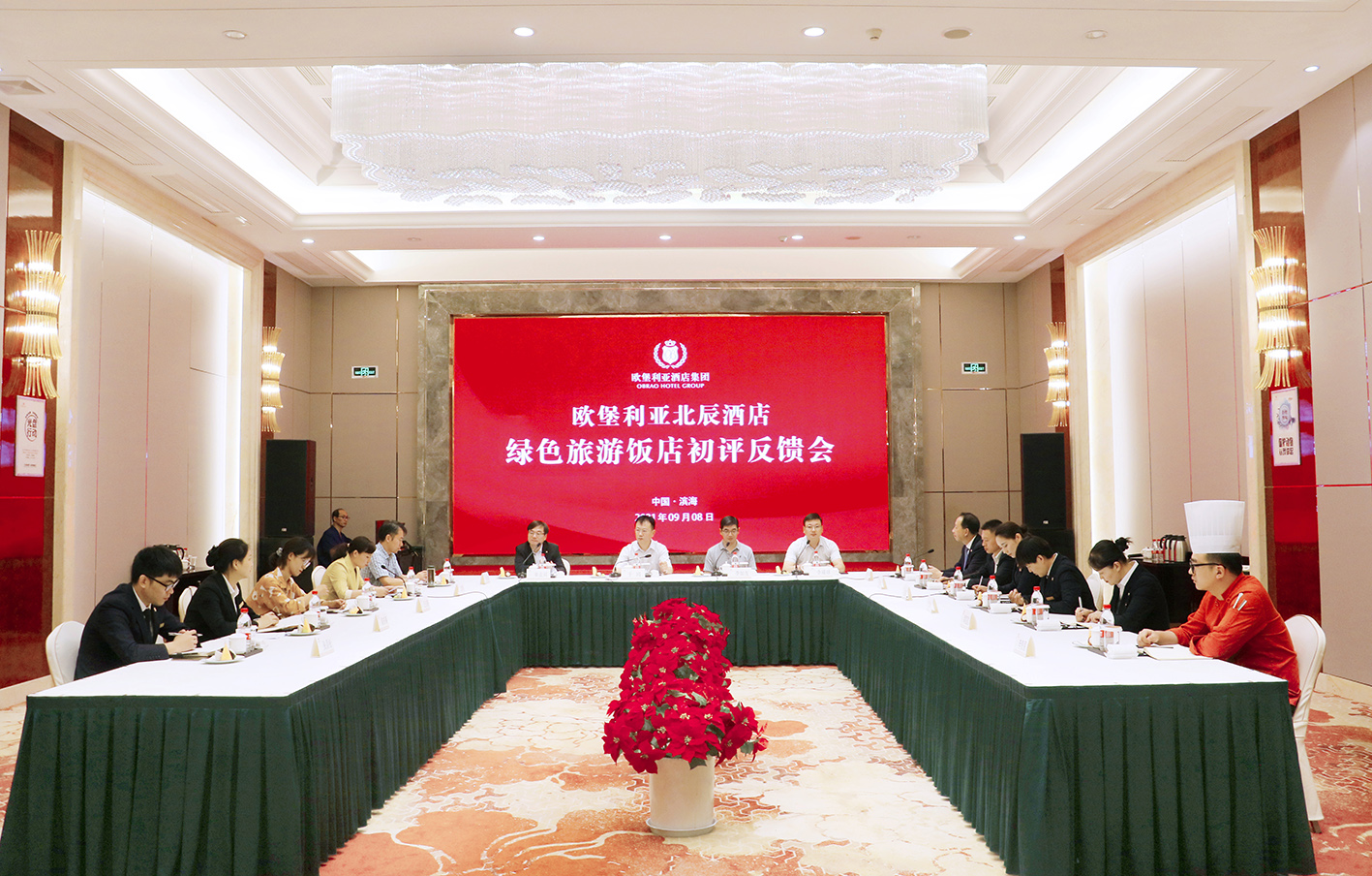 2021年9月7-8日,鹽城市星級旅游飯店評定委員會委派兩位市級星評員,對歐堡利亞北辰酒店開展為期兩天的金樹葉級綠色旅游飯店初評工作。市縣文廣旅局相關領導及兩位星評員、歐堡利亞酒店集團總經理鄧棟及副總經理胡也華、北辰酒店副店長朱麗麗及各部門負責同志,共同參加了“歐堡利亞北辰酒店金樹葉級綠色旅游飯店初評工作匯報會”。