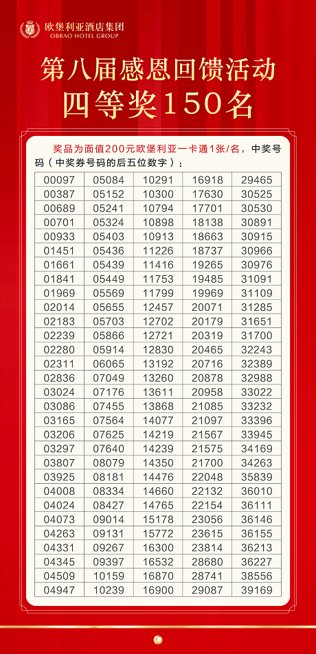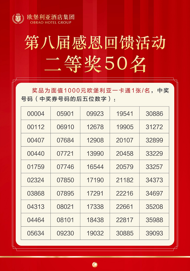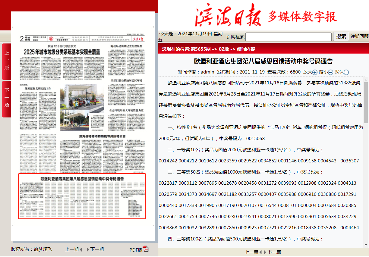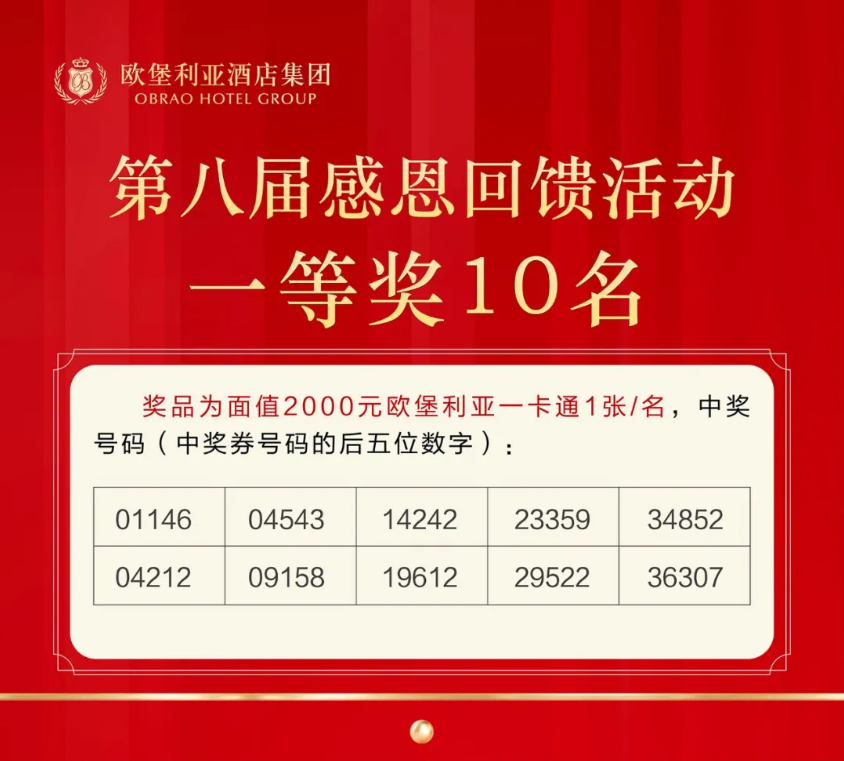 歐堡利亞酒店集團(tuán)第八屆感恩回饋活動(dòng)五個(gè)獎(jiǎng)項(xiàng)的中獎(jiǎng)號(hào)碼已在2021年11月19日《濱海日?qǐng)?bào)》上公布。